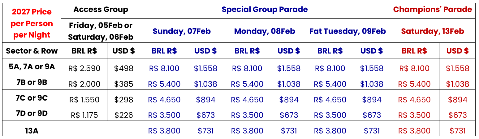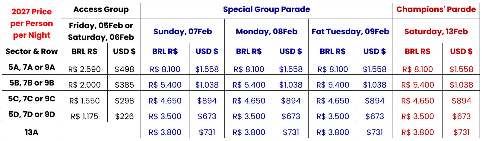 Rio Carnival Tickets prices are Fixed in Brazilian Reais BRL R$ and are converted to USD/EUR/GBP/AUD/CAD when Parade Date and Row are Selected